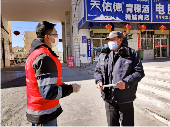 中广核新能源德令哈有限公司员工顾超、董翱配合当地团州委进入社区发放防疫物资,为小区喷洒消毒剂。