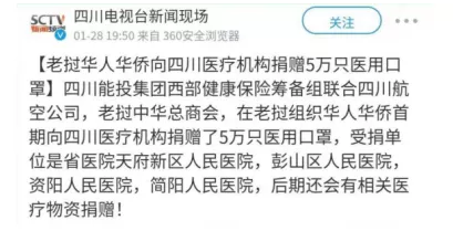 川能金鼎公司所属的西部健康保险筹备组联合四川航空公司、老挝中华总商会,在老挝组织华人华侨首期向四川省医院天府新区人民医院、彭山区人民医院、资阳人民医院、简阳人民医院等医疗机构捐赠了5万只医用口罩。目前西部健康保险筹备组正在持续协调相关组织,保证后期相关医疗物资捐赠工作。