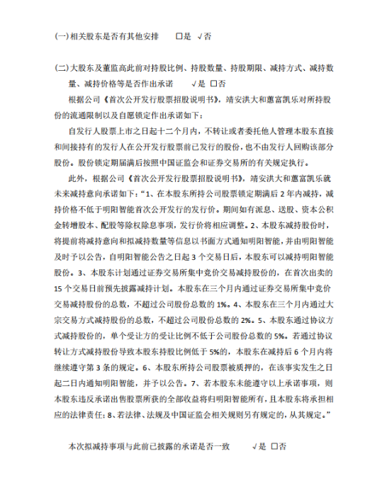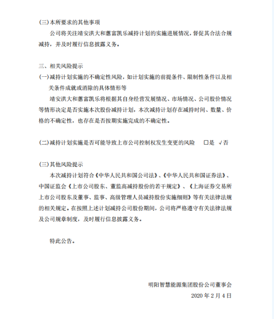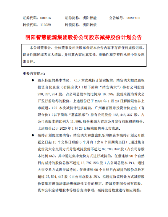 近日,明阳智慧能源集团股份公司发布股东减持股份计划公告,公告称靖安洪大、蕙富凯乐在本减持计划公开披 露之日起 15 个交易日后的 6 个月内(含 6 个月期满当日),通过集合 竞价及大宗交易方式分别减持股份不超过 82,783,342 股(占公司总股 本比例 6%)。其中通过集中竞价方式进行减持的,任意连续 90 个自然 日内减持的股份总数不超过 13,797,223 股(占公司总股本 1%);通过 大宗交易方式进行减持的,任意连续 90 个自然日内减持的股份总数不 超过 27,594,447 股(占公司总股本 2%)。拟通过协议转让方式减持股 份数量将遵循法律法规规范性文件的规定。若减持期间公司有送股、 资本公积金转增股本等股份变动事项,减持股份数量进行相应调整。