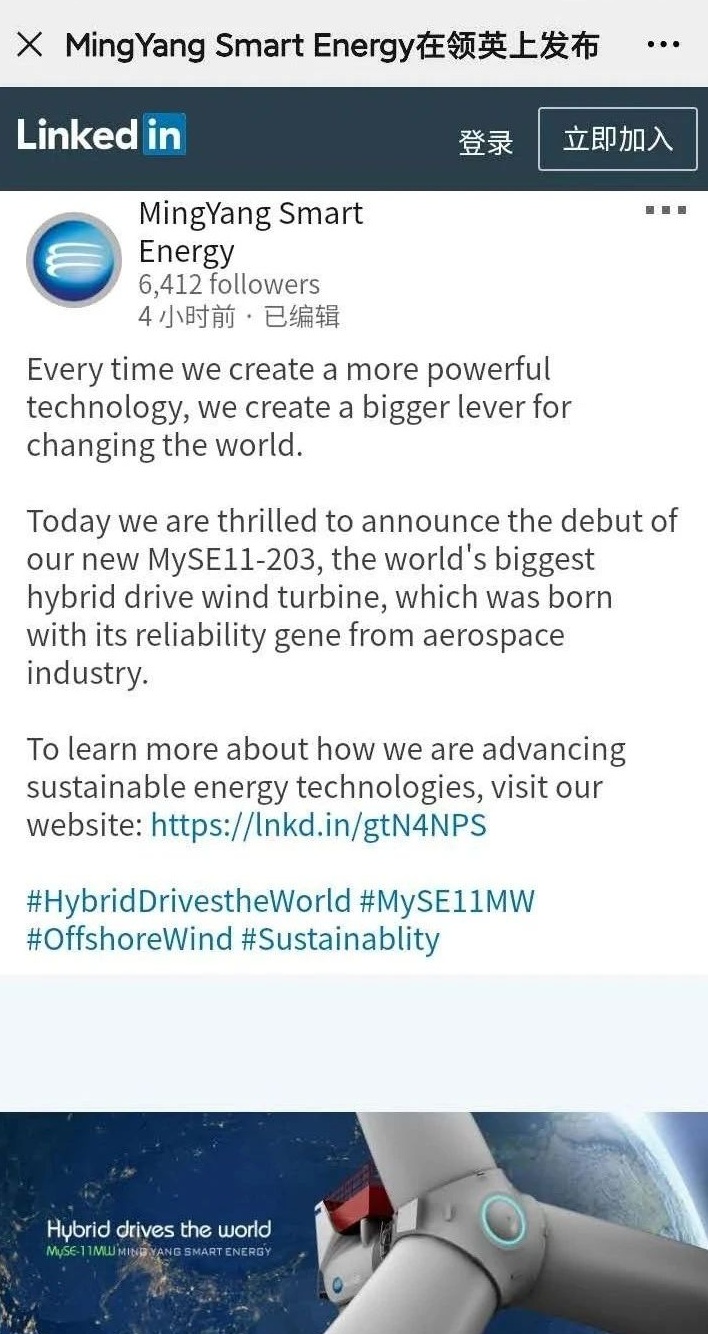 据获悉,明阳智能今日重磅发布MySE 11MW-203半直驱海上风机。该机型功率为11MW,叶轮直径为203米,一举超越东方风电10MW,中国海装200米叶轮直径,成为中国最大的海上风机。中国最大功率海上风机纪录提升至11MW。