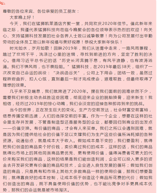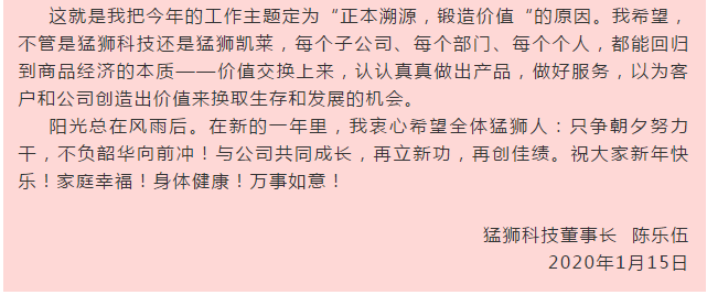 1月15日,猛狮科技、猛狮集团和猛狮凯莱酒店联合举办2020迎春联欢会,陈乐伍董事长发表“正本溯源 锻造价值”主题讲话,全文如下: