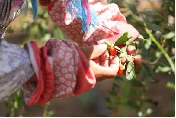 枸杞是宁夏的名片。宝丰集团对宁夏黄河东岸滨河新区16万亩荒漠化土地进行生态治理的同时,种植10万亩优质有机枸杞,并着力构建从枸杞种植、研发、加工到营销于一体绿色生态产业链,助力宁夏优势特色产业提档升级、高质量发展。