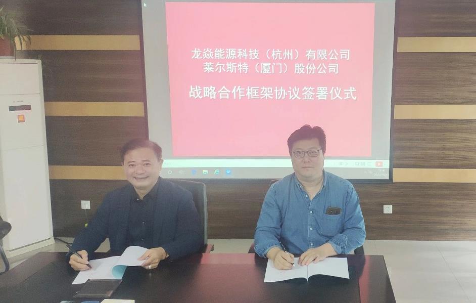 10月15日, 莱尔斯特副董事长廖志山、总工程师姜春升和销售总监张功武一行来访龙焱能源杭州总部。龙焱能源科技CEO吴奔与莱尔斯特廖董事长现场签署了本次协议。双方共同表示,将在各自开发、承接或接触的有关彼方经营范畴的相关光伏幕墙、新能源光伏项目进行全面合作,包括常规分布式光伏项目和BIPV建筑光伏项目,共同推动绿色建筑和可再生能源的持续发展。