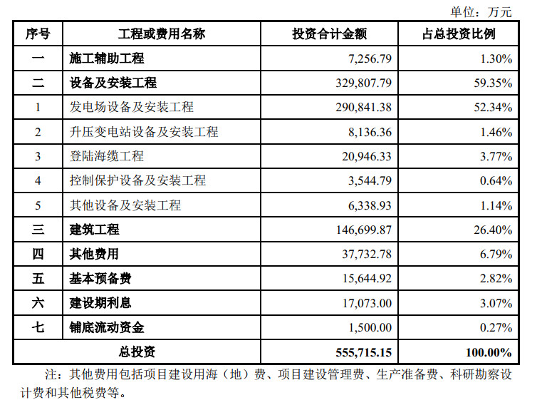 浙能嘉兴1号海上风电场工程项目根据可研阶段价格水平静态总投资为537,142.15 万元,建设期利息 17,073.00 万元,铺底流动资金 1,500.00 万元,项目总投资是 555,715.15 万元。具体情况如下: