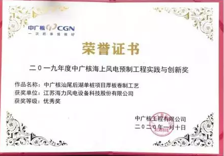 2020年1月10日,江苏海力风电设备科技股份有限公司(以下简称“海力风电”)在深圳市大鹏新区大亚湾核电基地AE楼召开的中广核海上风电预制工程2019-2020年度工作会议上荣获两个“二〇一九年度中广核海上风电预制工程实践与创新奖”,获奖作品分别为:牺牲阳极结构优化(二等奖)和中广核汕尾后湖单桩项目厚板卷制工艺(优秀奖)。
