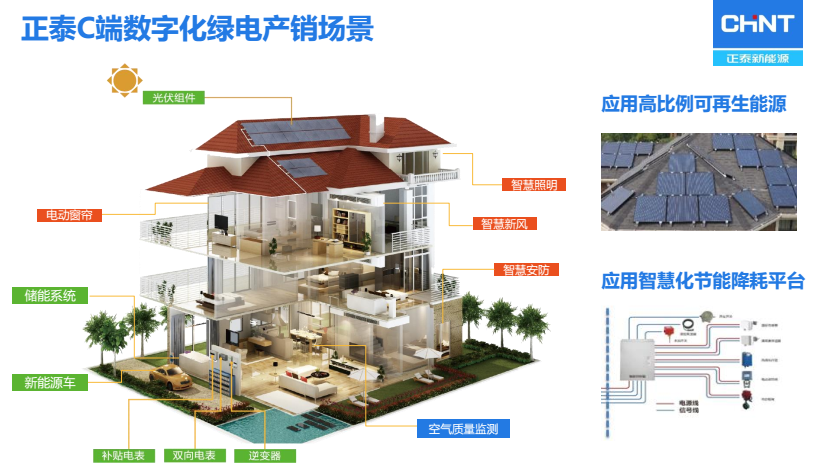 中国“努力争取2060年前实现碳中和”的目标离不开高比例可再生能源、高效智能化节能降耗。不仅是大型发电厂,居民分布式应用侧亦可做出较多贡献。在国内C端领域,正泰应用了诸多场景和技术(光伏、楼宇能效、储能等),助力实现碳中和目标。截止2020年6月,正泰户用光伏安装累计达40万户。全国已建设运营400多个运维服务网点,1300多位运维服务人员,基本覆盖国内主要做居民分布式太阳能的省份。