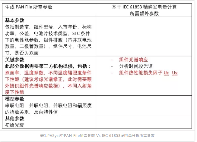 表1.PVSyst中PAN File所需参数 Vs IEC 61853发电量分析所需参数