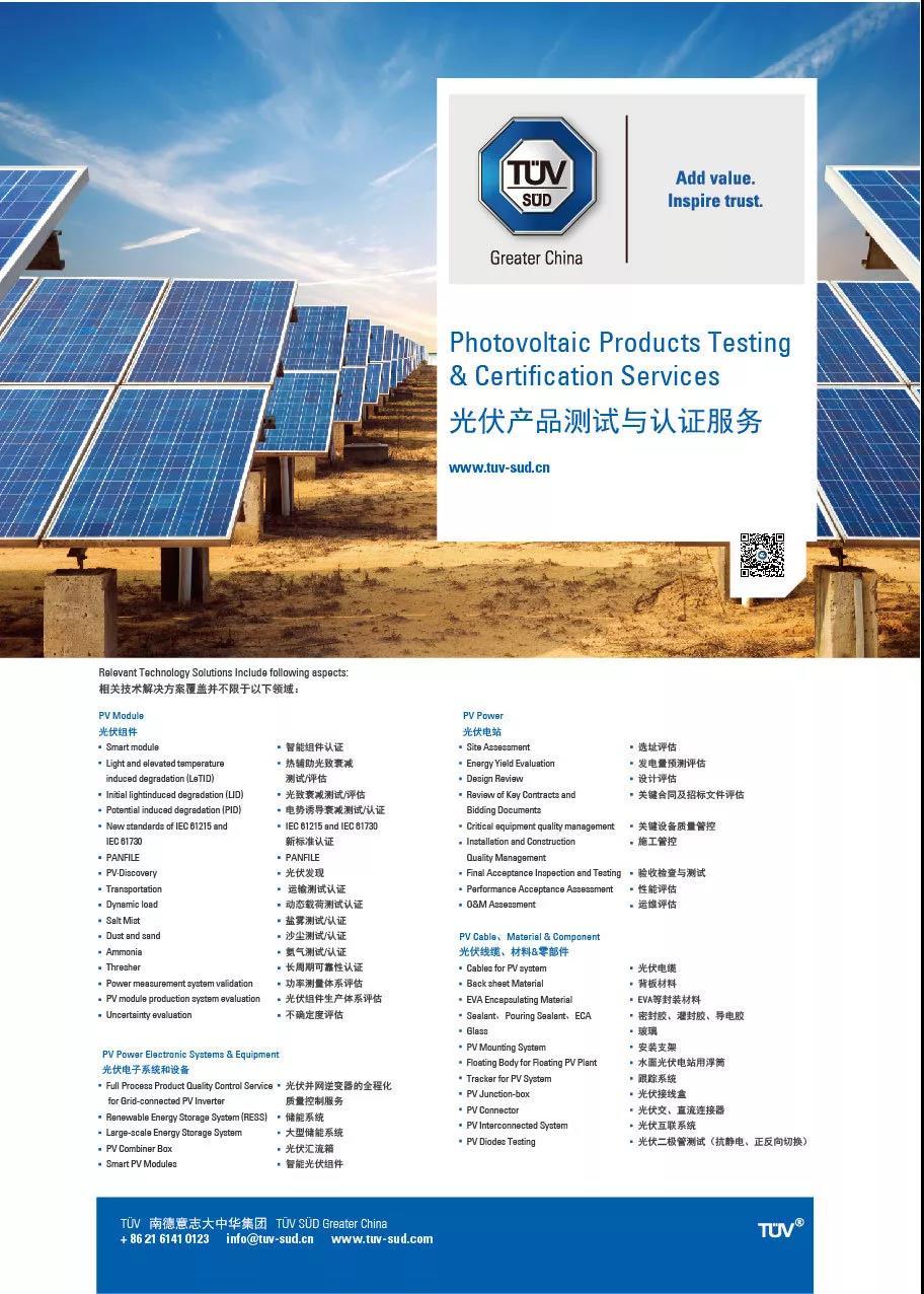 TÜV南德深耕中国光伏及智慧能源十年多,具有丰富的检测认证经验,能够从原材料到系统终端的全产业链,提供一站式、多市场的技术解决方案。TÜV南德积极参与光伏及智慧能源领域标准的研究和制定,为广大企业提供检测认证技术服务,并在上海、南京、扬州、常州、无锡、深圳,北京,天津,海南等地拥有多家(含合作)测试中心以及近百位技术专家,是全球领先的光伏和智慧能源产品认证与测试服务解决方案供应商。