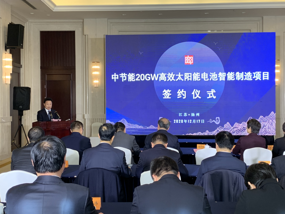 2020年12月17日,中节能太阳能高邮20GW高效电池制造基地(一期)项目投资协议签约仪式在江苏省扬州市举行,标志着中节能太阳能高邮20GW高效电池制造基地(一期)项目正式投资建设。扬州市委副书记、市长张宝娟、副市长方桂林,高邮市市委书记韦峰、市长张利,中节能太阳能股份有限公司(以下简称中节能太阳能)党委书记、董事长曹华斌,副总经理张蓉蓉、副总经理姜利凯、总经理助理黄中化及中节能太阳能科技(镇江)有限公司党总支书记、董事长李菁楠、总经理黄国平出席活动。