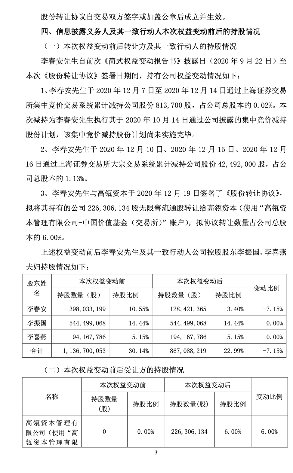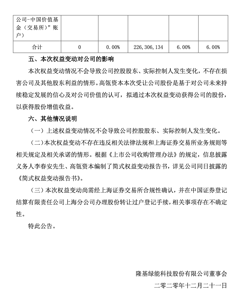 2020年12月20日,隆基股份发布公告《关于股东拟协议转让股份暨股东权益变动的提示性公告》(全文附后),李春安与高瓴资本签署股份转让协议: