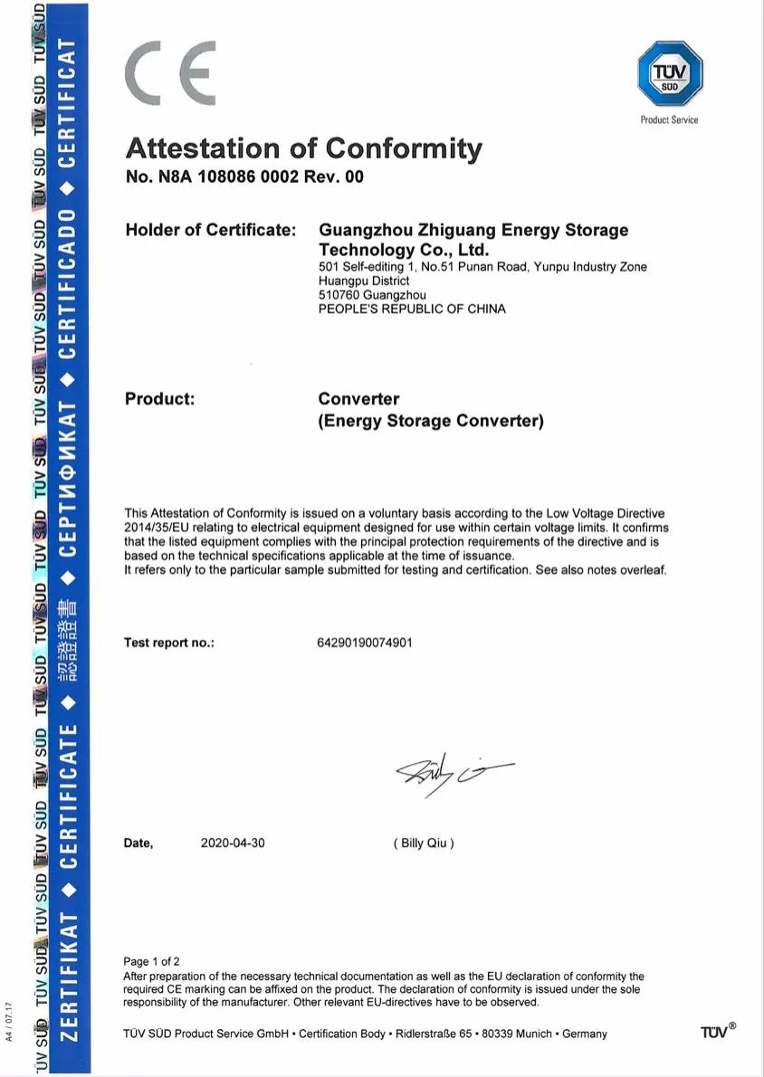 智光储能630kW储能变流器获得TUV认证证书,该产品已符合现有欧盟安全、功能、性能标准要求,体现了智光电气的科研和质量管控实力,未来将助力广州智光进一步开拓海外市场。