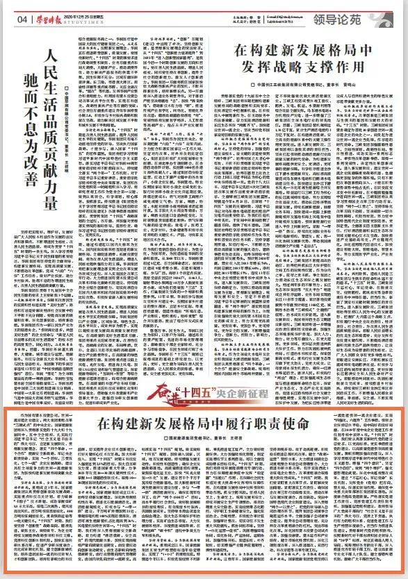 2020年12月25日,《学习时报》刊发国家能源集团党组书记、董事长王祥喜署名文章《在构建新发展格局中履行职责使命》。