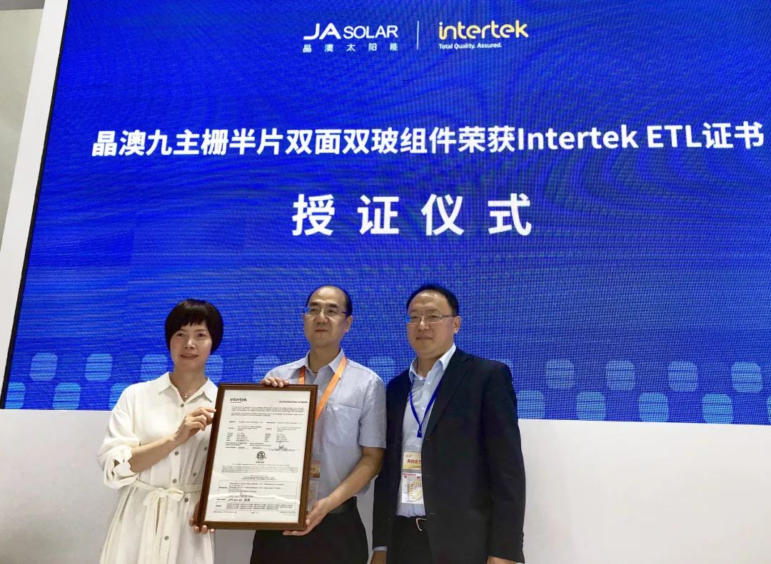 2019年6月4日,SNEC第十三届(2019)国际太阳能光伏与智慧能源(上海)展览会暨论坛开幕,晶澳太阳能所展出的九主栅半片双面双玻单晶组件获得Intertek天祥集团颁发的UL61215及UL61730标准的ETL证书。