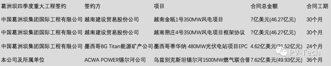 3、本公司所属中国葛洲坝集团国际工程有限公司与墨西哥BG Titan能源矿产公司签署墨西哥蒂华纳480MW光伏电站项目EPC商务合同,合同金额约4.62亿美元,约合人民币31.52亿元,合同工期为24个月。