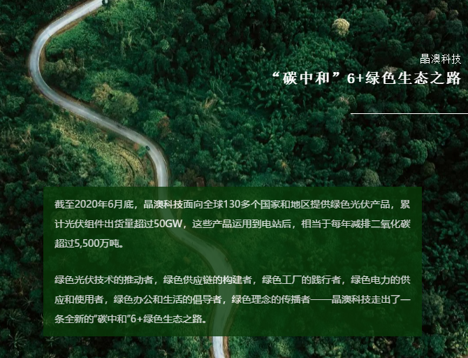 目前,晶澳先后加入联合国全球契约组织、中国绿色供应链联盟光伏专业委员会和中国企业气候行动,并连续两年获得中国社会责任百人论坛颁发的中国企业社会责任“绿色环保奖”。作为光伏发电解决方案平台企业,晶澳将继续践行绿色发展之路,用实际行动助力《巴黎协定》推进和实现中国“碳中和”目标。