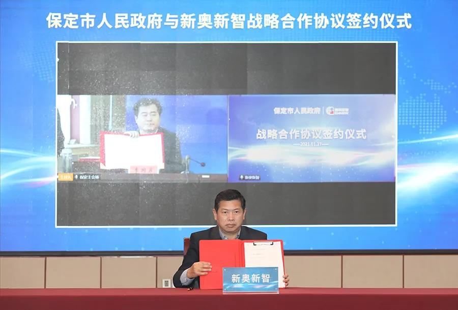 1月27日,在保定市重点合作项目云签约仪式上,新奥新智与保定市政府签署战略合作协议。