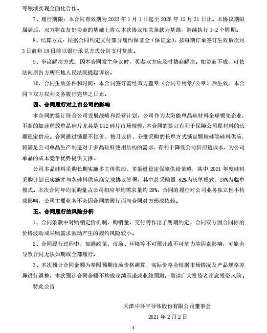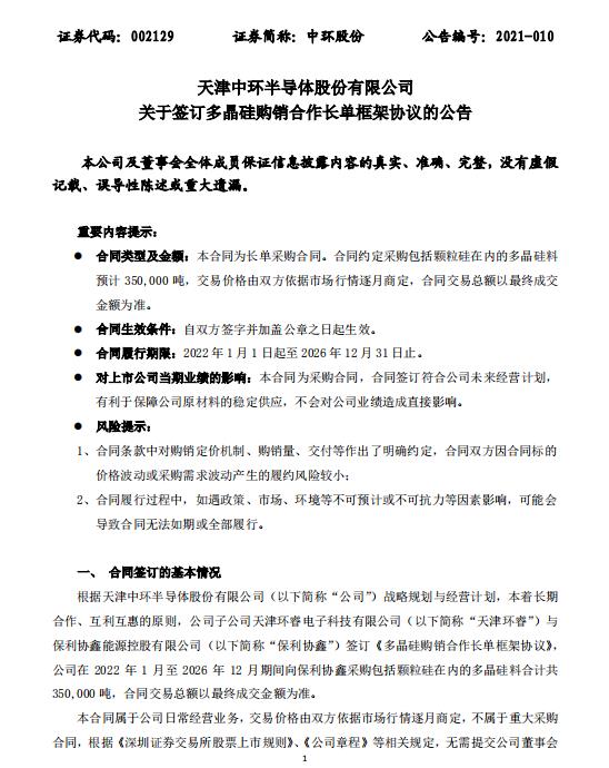 据报道,中环股份2月2日晚间公告称,子公司天津环睿与保利协鑫签订《多晶硅购销合作长单框架协议》,公司在2022年1月至2026年12月期间向保利协鑫采购包括颗粒硅在内的多晶硅料合计共350,000 吨,合同交易总额以最终成交金额为准。