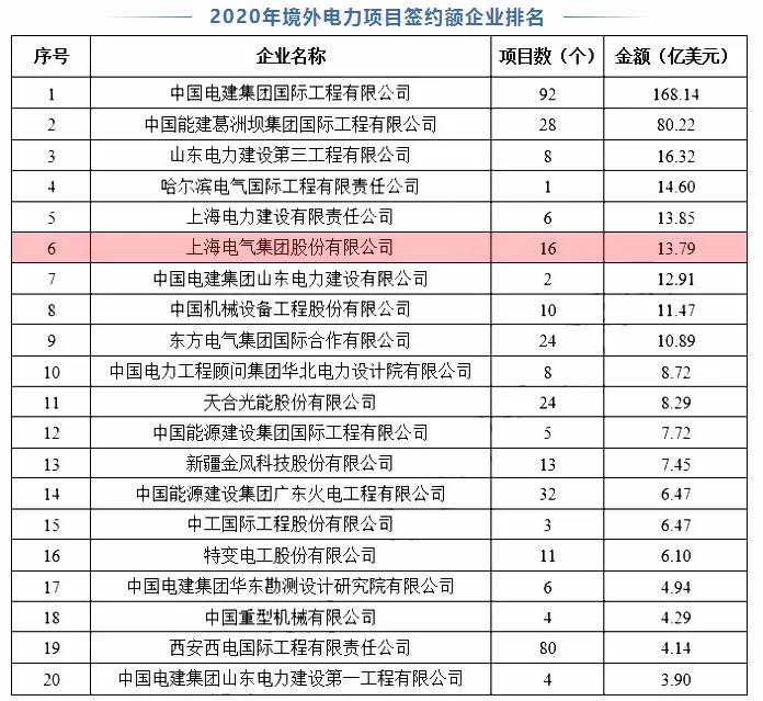此外,在“2020年境外输变电项目签约额企业”排名分榜中,上海电气以1.16亿美元的金额位列第8。