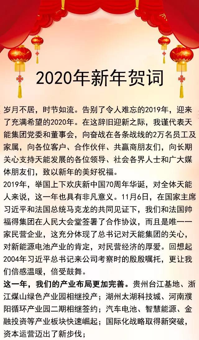 伴随着新年的第一缕曙光,我们告别了令人难忘的2019年,迎来了充满希望的2020年。值此辞旧迎新之际,天能集团党委书记、董事长张天任通过天能集团新媒体平台,发表新年贺词。