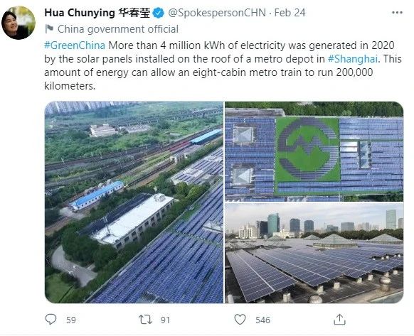 近日,中国外交部发言人华春莹在推特上发了这样一条动态,向全世界介绍了中国的一项新能源样板工程——上海地铁龙阳路基地3.66MW光伏发电项目。字里行间洋溢着华春莹女士对该项目 “点赞”之情,上海地铁龙阳路基地光伏发电项目也随之引起广泛关注,其中天合光能提供的光伏组件产品达12912块,年均发电量约为340万度,可供一列8节编组的地铁列车跑20万公里。天合光能已经总计为上海地铁光伏发电项目提供7MW组件。