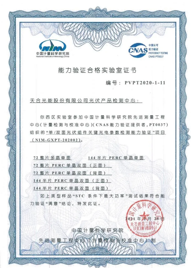 2020年11月天合光能参加了由中国计量科学研究院举办的“单/双面光伏组件关键光电参数检测能力验证”。近日,常州基地东区和西区两个实验室参加的共六个项目测试均获得“满意”结论,并获得“能力验证合格实验室证书”。