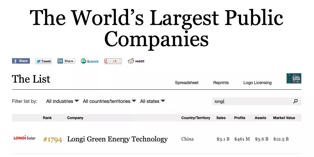 5月16日,《福布斯》发布“全球上市公司2000强榜单”,隆基股份位列榜单1794位。