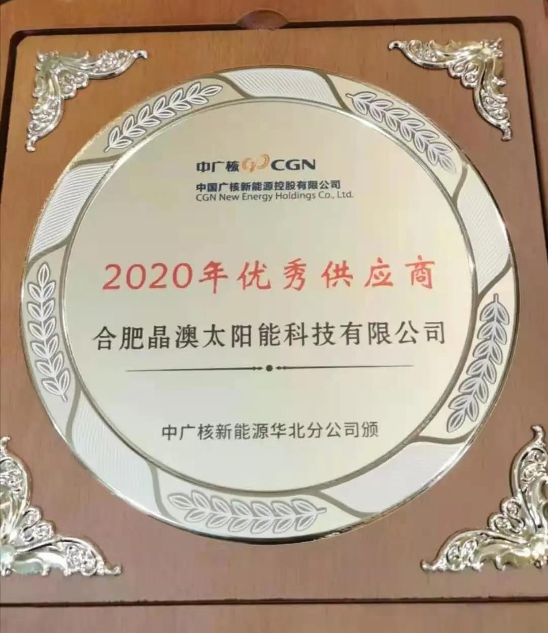 近日,中广核新能源控股有限公司为晶澳科技颁发了 “2020年优秀供应商”感谢牌,以感谢晶澳科技心系客户,全力保障中广核新能源河北300MW项目的供货,为项目进度的正常推进给予的大力支持。