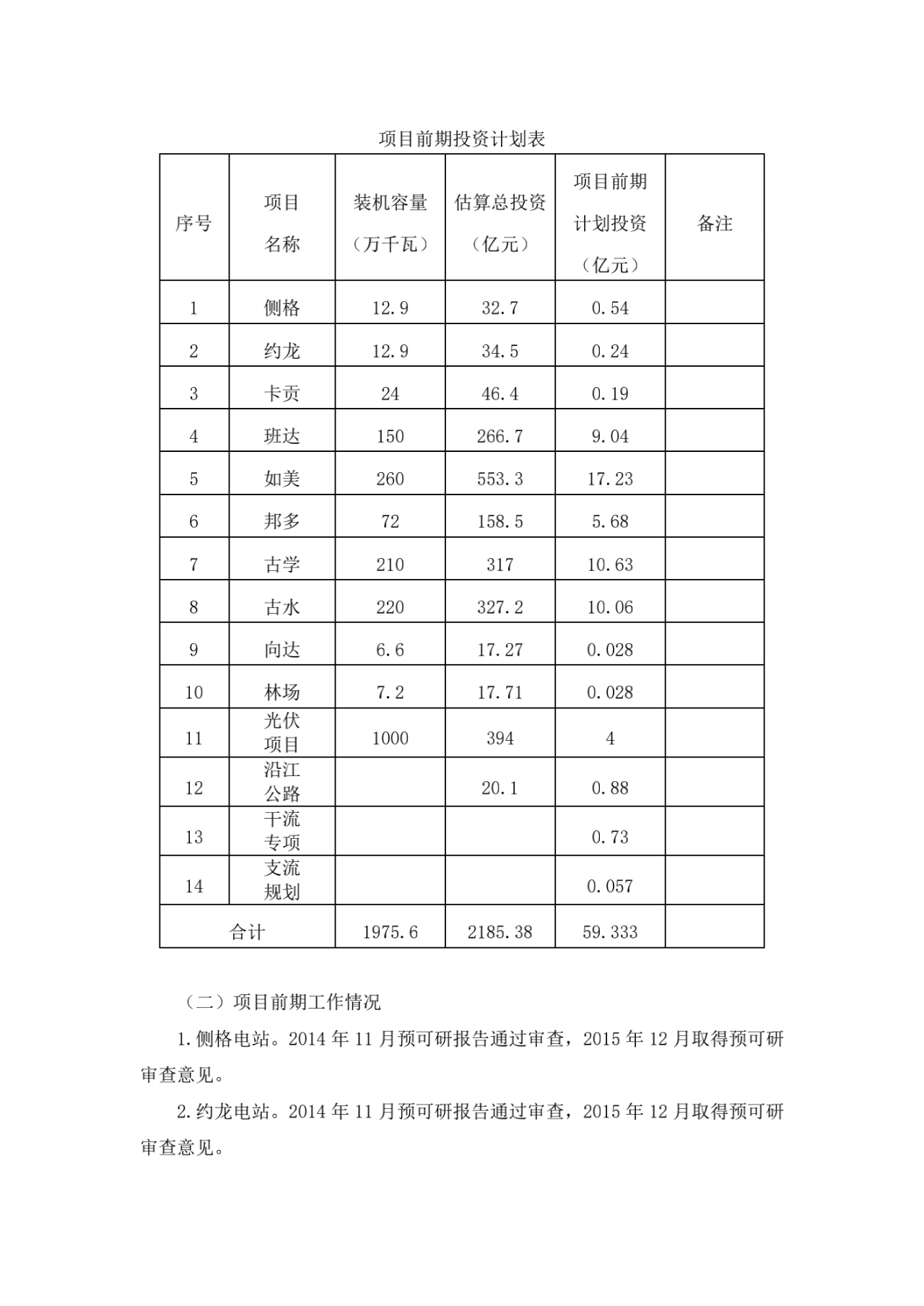 根据公告,澜沧江上游西藏段干流规划有8个梯级,从上至下依次为侧格、约龙、卡贡(24万千瓦)、班达、如美、邦多、古学,古水,装机容量合计961.8万千瓦。澜沧江上游西藏段项目前期工作已经展开,预计投资为59.33亿元,包含初步估计的全部前期管理费和利息费,主要为澜沧江干流及支流项目已开展的项目前期费用及专项费用。光伏方面正在开展澜沧江上游西藏段千万千瓦级清洁能源基地战略定位研究、规划研究、水光互补关键技术研究等工作,前期总投资为4亿元。具体见下表: