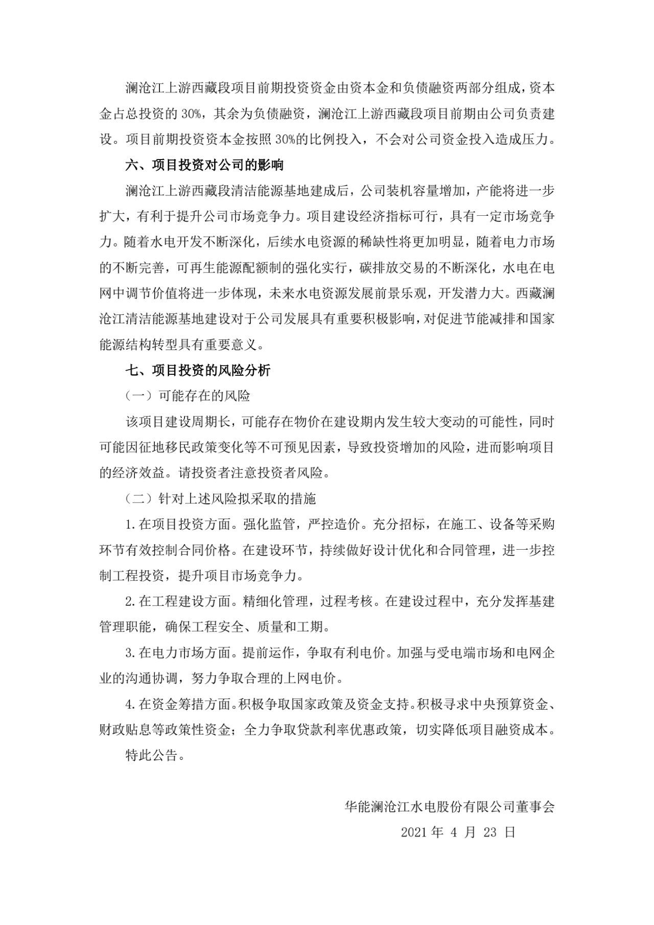 根据华能水电表示,2020年,华能水电总资产达到了1646.32亿元,其当年营业收入192.53亿元,实现归母净利润48.34亿元。本次投资将分为资本金和负债融资两部分,资本金占项目前期以及总投资的比列为30%。待项目建成后,华能水电的装机量将进一步增加,有利于提升其市场竞争力,对其发展具有重要的积极影响。