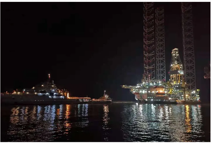 大马力拖轮将“国信”号石油钻探平台缓缓拖离