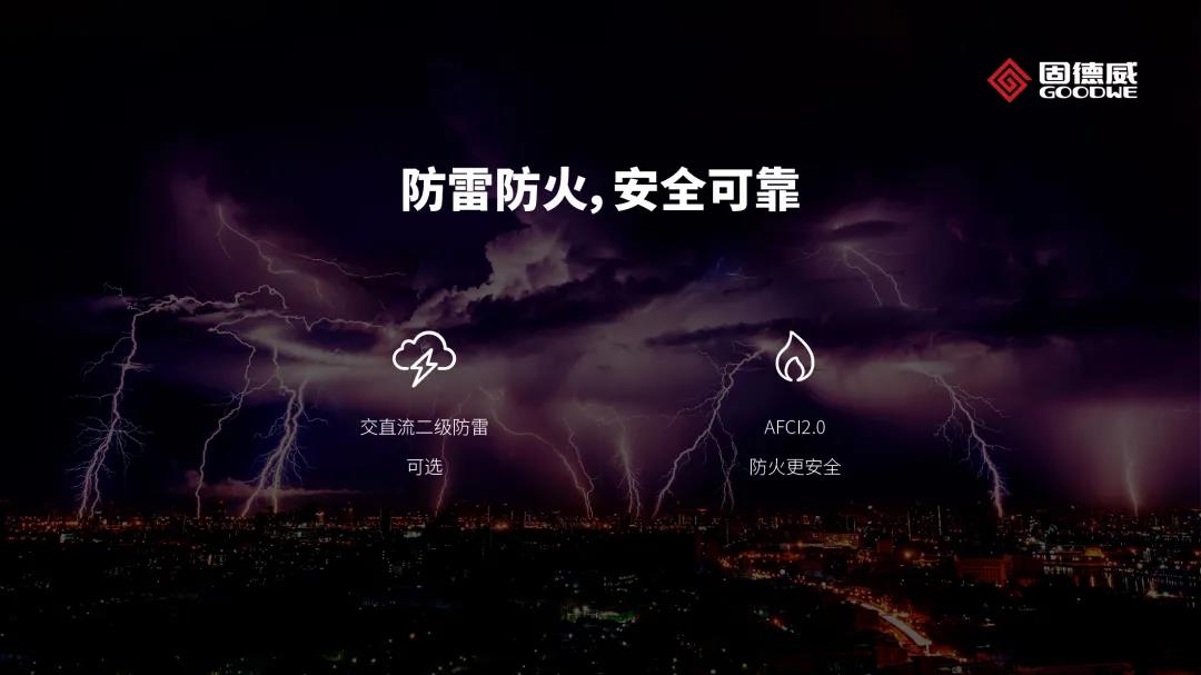 由于户用光伏电站大多是安装在家庭的屋顶上的,所以电站的安全变成了头等大事,一但发生事故后果不堪设想。为保障客户生命财产安全,固德威在设备安全方面做了颇多付出,现在已经开发出AFCI2.0(直流拉弧检测),25kW机型可以加装选配,直流拉弧检测不误报、不漏报,几乎100%保障直流侧安全。另外,25kW机型在直流侧和交流测都有防雷设置,杜绝雷击隐患,防雷更安心。