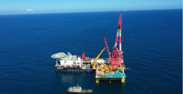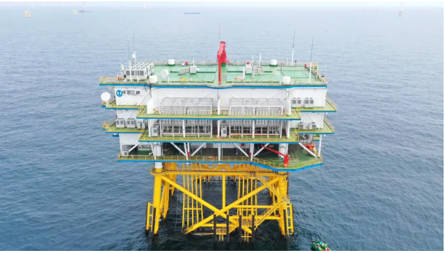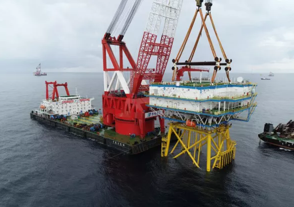 完成国内首座斜桩植入嵌岩导管架基础海上升压站吊装