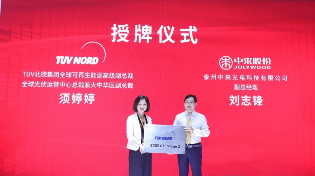 TÜV北德集团全球可再生能源高级副总裁、全球光伏运营中心总裁兼大中华区副总裁须婷婷女士,中来股份副总裁、泰州中来光电科技有限公司副总经理刘志锋博士等领导出席授牌仪式。TÜV北德向泰州中来光电颁发TÜV北德CB实验室认可资质证书并授牌。