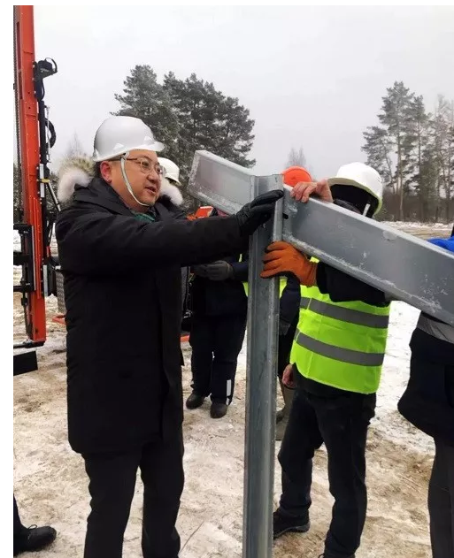 公司党委书记、董事长郭玮冒着零下10几度的低温,来到白俄罗斯切里科夫(Cherikov)130兆瓦光伏项目现场视察,并与当地业主方共同举行项目开工仪式和新闻发布会。伴随着打桩机的轰鸣声,在鹅毛般的飞雪中光伏支架被一寸一寸的打入雪地下,白俄罗斯切里科夫 130兆瓦光伏发电项目正式开工建设。