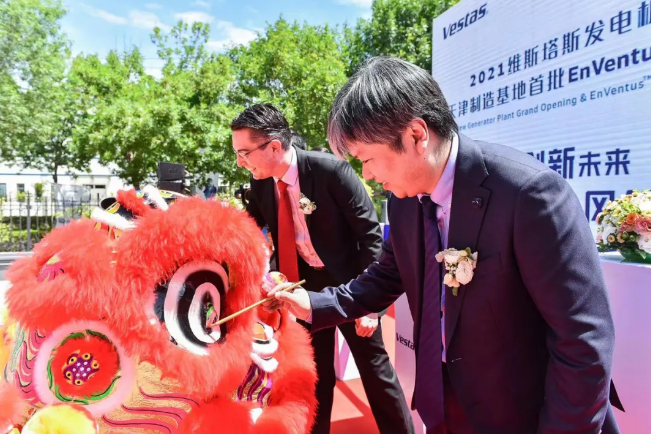 2021年6月18日,维斯塔斯发电机新厂在天津泰达经济技术开发区落成开业,此举标志着维斯塔斯在华制造布局正式迈入6MW时代。该发电机厂投资额约2亿元人民币,占地面积超过15万平方米,生产车间占地面积近9千平方米,主要用于为维斯塔斯全球领先的6MW EnVentus™风机平台生产发电机部件。新的发电机厂的设计产能为每年1500台,2021年产值预计达到8亿人民币,并在未来直接创造120多个就业机会。