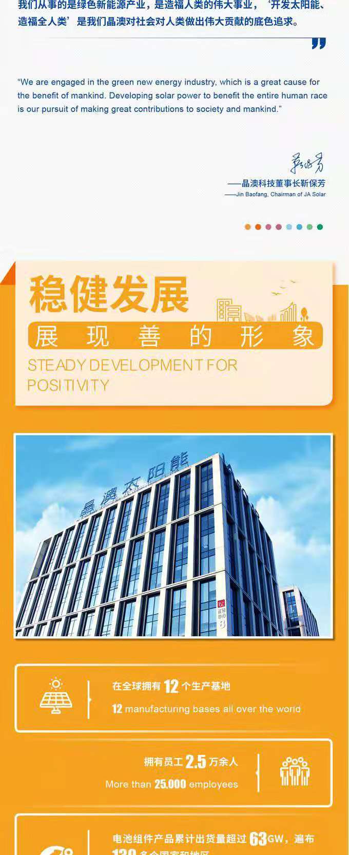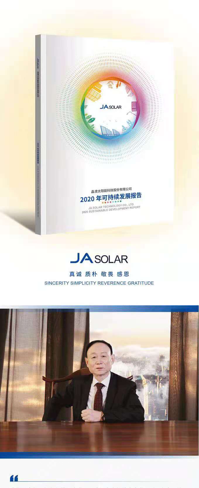 2021年6月21日,《晶澳太阳能科技股份有限公司2020年可持续发展报告》(中/英文)正式发布,报告依据GRI标准,通过中英文对照形式,分别从稳健发展、强化治理、关爱员工、卓越品质、绿色友好、安全经营、生态合作、社会公益等8个方面,全面阐述晶澳科技可持续发展实践。