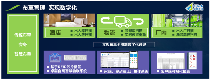 回到品类,除了硬件,卓惠还有完善的设施,机械化场内管理,可以满足标准要求,以及各大酒店集团布草品质洗涤要求。另外,近几年整个酒店行业都在大力推进数字化的转型,如何实现布草数字化?其实很简单,只要把传统的布草变身,升级为智慧布草,再结合软件就可以实现。