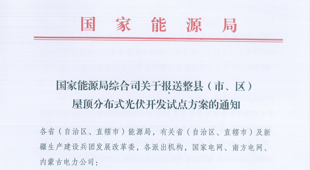 近日,国家能源局综合司下发关于报送整县(市、区)屋顶分布式光伏开发试点方案的通知,为加快推进屋顶分布式光伏发展,国家能源局拟在全国组织开展整县(市、区)推进屋顶分布式光伏开发试点工作。