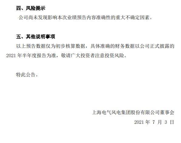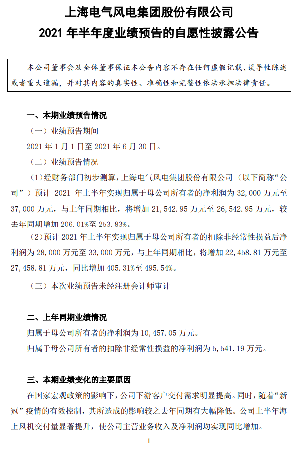 电气风电7月2日晚间发布业绩预告,经财务部门初步测算,上海电气风电集团股份有限公司预计2021年上半年实现归属于母公司所有者的净利润为3.2亿元至3.7亿元,与上年同期相比,将增加约2.15亿元至约2.65亿元,较去年同期增加206.01%至253.83%。