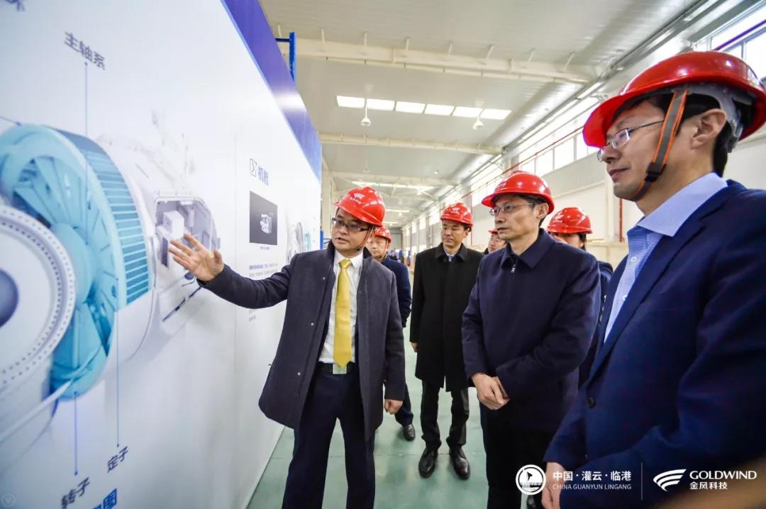 ↑金风科技副总裁李飞陪同中共灌云县委书记左军参观工厂