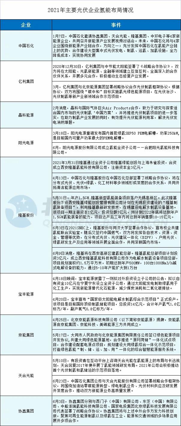 自今年(2021年)年初以来,以隆基、阳光、晶科、协鑫等为代表的光伏企业正加速布局氢能领域,其主要动态如下: