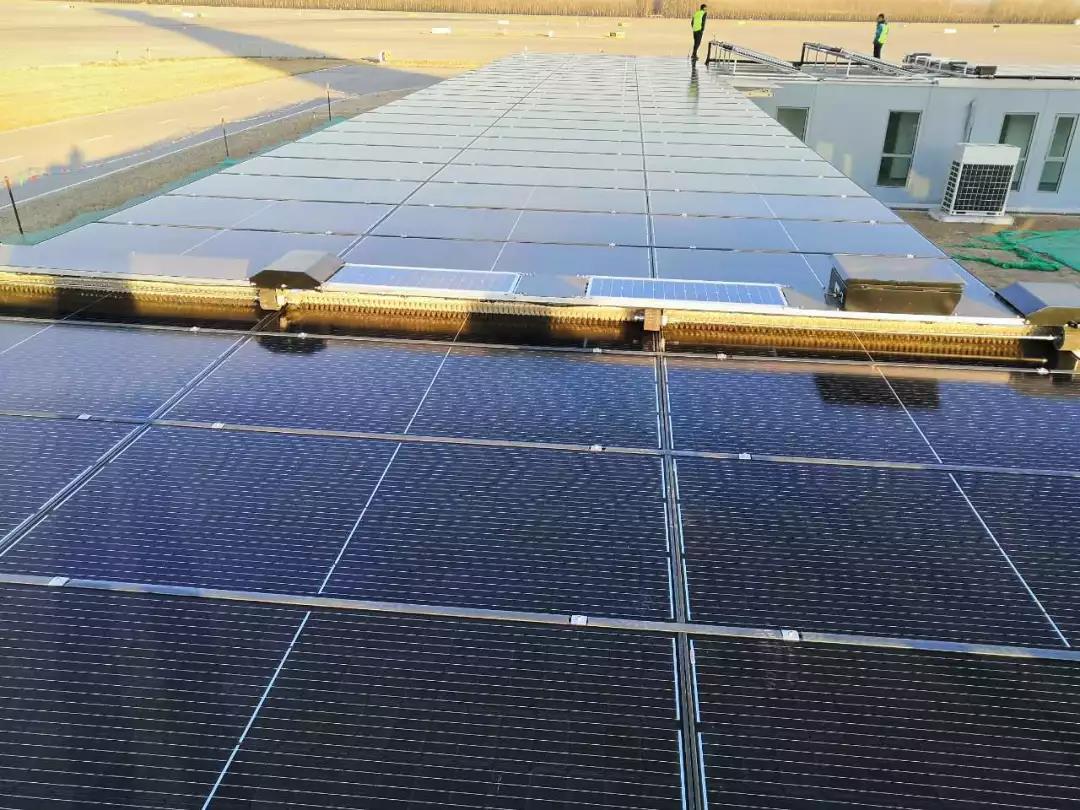 该项目位于首都机场东区机坪管制塔台生活配套集成房屋屋顶,紧靠机场跑道,道路扬灰为项目主要污染物。项目在采用智能运维机器人后,能够实现电站的自动化清洗,无需人工介入,高频次的自动化清扫使组件基本保持无尘状态,能够有效提升电站发电量。