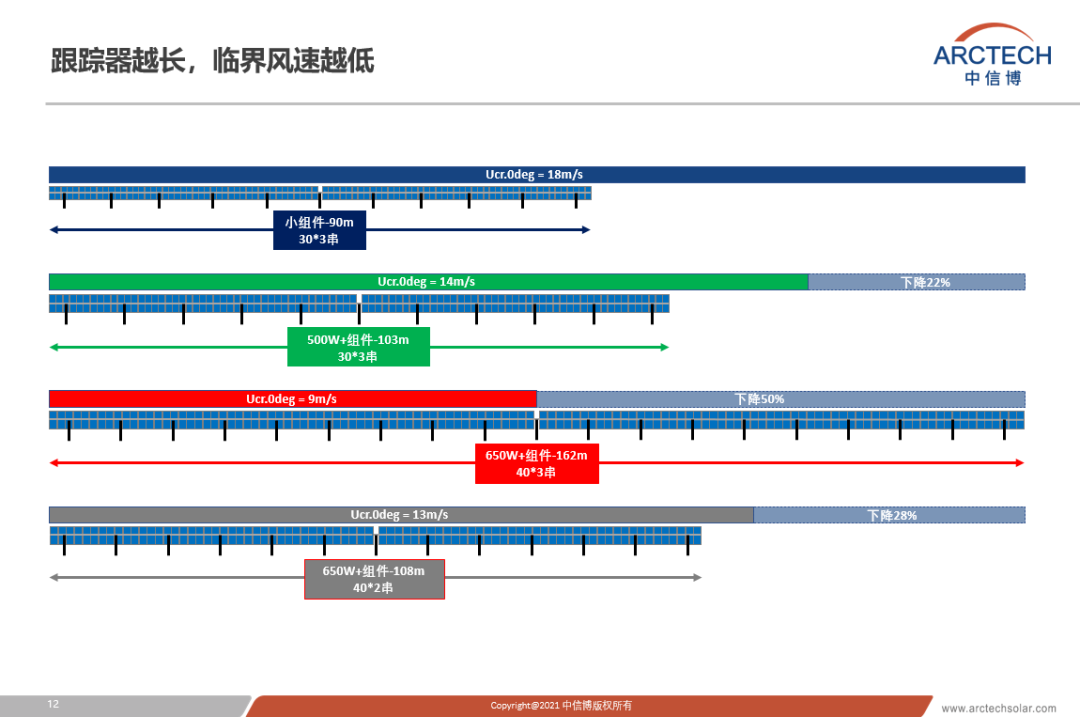 针对高功率组件,中信博重新进行了风洞测试。测试数据表明,一方面,由于高功率组件的长度变长,压力系数和扭矩系数变大,直接导致跟踪器系统在受到原先相同风速下时,风荷载显著增大。另一方面,组件的宽度变宽,使跟踪器的总长变长,降低了系统稳定性,为了保证跟踪器的安全,其需要更加频繁的进入大风保护模式,直接影响发电量。