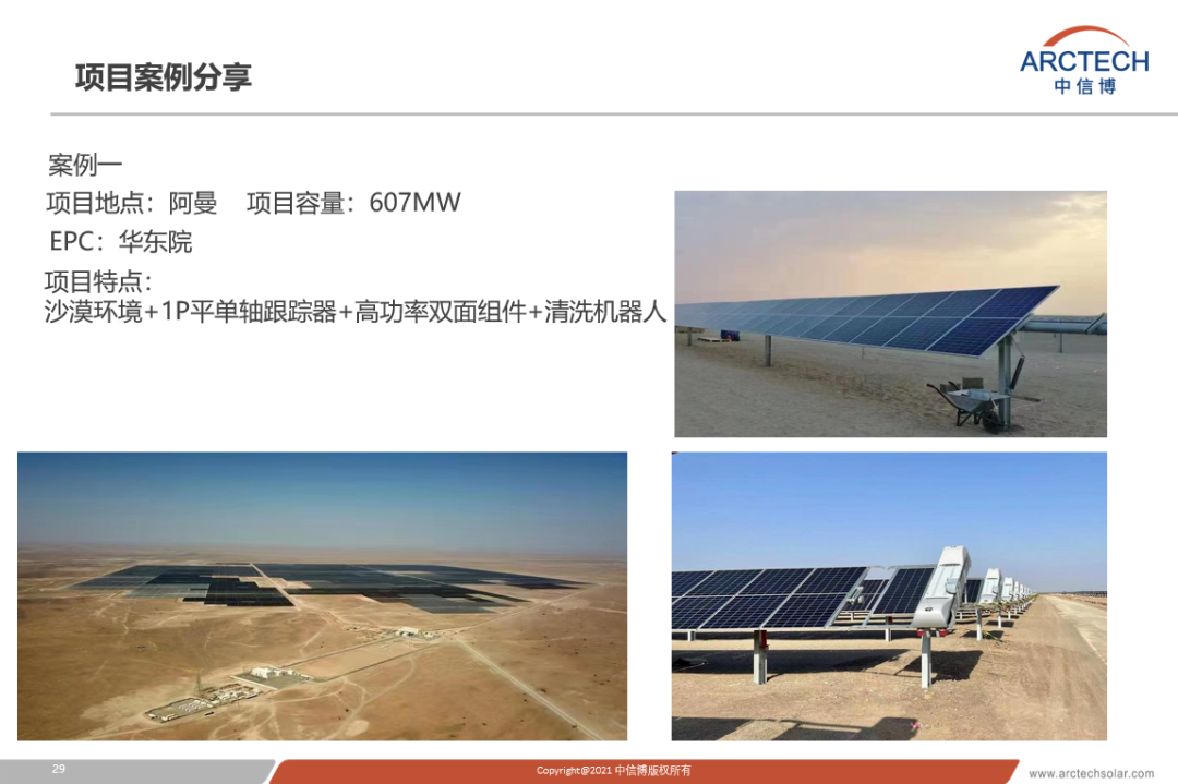 据杨颖介绍称,在中信博位于阿曼607MW天际跟踪项目中,即采用了跟踪系统+高功率双面组件+清洗机器人的组合方式,彻底解决了项目地处沙漠地区所带来的运维及时性问题,从而使组件及电站的发电效率最大化,有效降低了项目的LCOE。杨颖还认为,未来在中国西北和北部区域内的沙漠光伏电站中,运维机器人+跟踪系统+高效双面组件的组合方式或将成为地面光伏电站的“黄金搭档”。