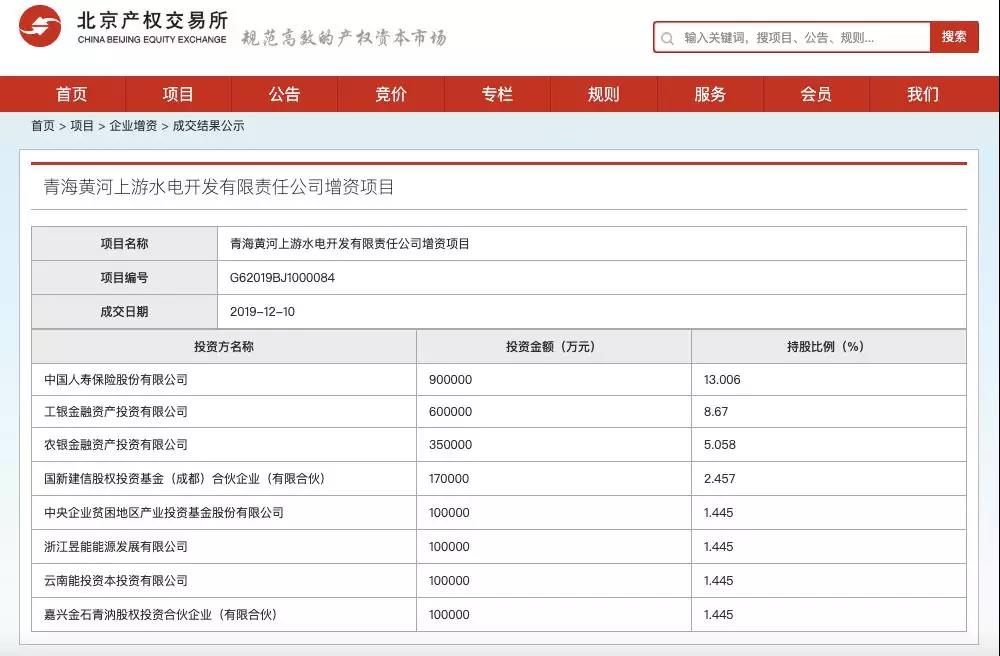 2019年3月,国家电投正式启动黄河项目增资引战工作。9月6日,黄河项目在北交所挂牌公示,引起资本市场热烈反应,获得投资机构普遍认可。11月7日,黄河项目完成在北京产权交易所的挂牌交易,引入了中国人寿、工商银行、农业银行、中国国新、国投集团、浙能集团、云南能投、中信证券8家具有重要战略协同效应的产业集团和金融机构。其中,中国人寿投资90亿元,持股13.006%;工商银行投资60亿元,持股8.67%;农业银行投资35亿元,持股5.058%;中国国新投资17亿元,持股2.457%,其余四家各投资10亿元,分别持股1.445%,总共募资242亿元,相关资金将主要用于开发青海省海南州、海西州等大型能源基地,偿还银行贷款等。