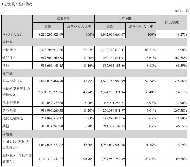 另外值得关注的是,阳光电源海外业绩占比从去年的28.64%上升至50.70%,海外业务占比已经超过国内业务。