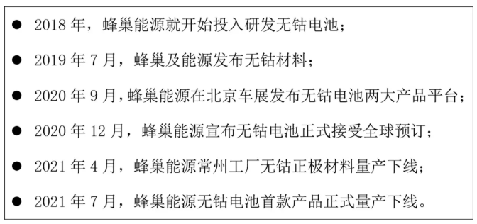 蜂巢能源无钴电池产业化时间节点