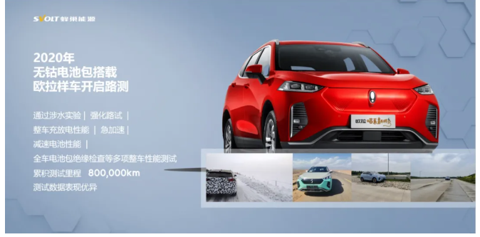 在产品验证上,无钴电池包从2020年开始搭载欧拉样车路测,通过涉水实验、强化路试、整车充放电性能、急加速、减速电池性能、全车电池包绝缘检查等多项整车性能测试,累积测试里程80万公里,测试数据表现优异。