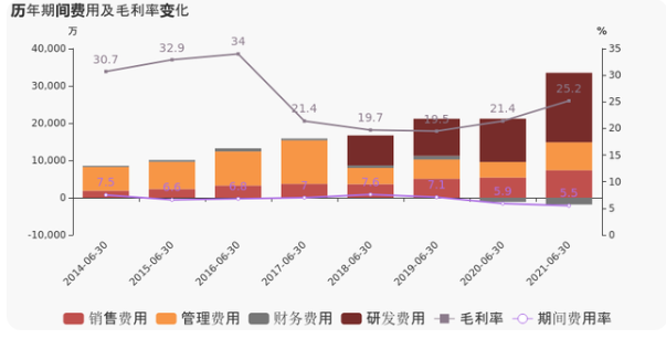 公司2021半年度营业成本42.7亿,同比增长61%,低于营业收入69.3%的增速,导致毛利率上升3.8%。期间费用率为5.5%,同去年相比变化不大。经营性现金流由2.3亿下降至-6.3亿,同比下降375.5%。