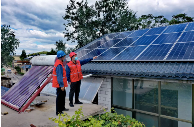 ▲国网河北平山供电公司党员服务队队员在查看乡村屋顶光伏设备